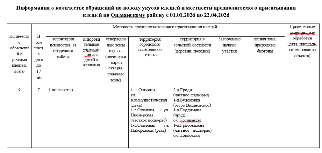 За период с 01.01.2026 по 22.04.2026 в организации здравоохранения Ошмянского района по поводу укусов клещей обратилось 9 человек, из них 7 детей до 18 лет.